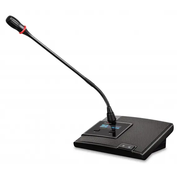 Проводной микрофонный пульт председателя EG-6620C на "гусиной шее" черного цвета. Длина микрофона «гусиная шея» 420 мм. Совместим с блоком управления EG-6620M. Получает питание от центрального блока. Микрофонный пульт председателя поддерживает функцию управления пультами делегатов (вкл/выкл), оснащен OLED экраном и кнопками регулирования громкости встроенного динамика и наушников.