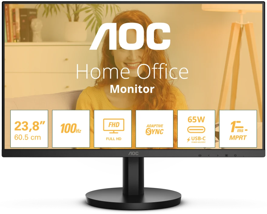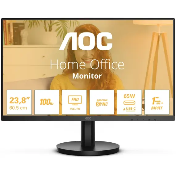 Монитор AOC 23.8", IPS, 1920x1080 (Full HD), 1 мс, 100 Гц, 250 кд/м2, HDMI, USB Type-C, динамики, чёрный (24B3CA2)