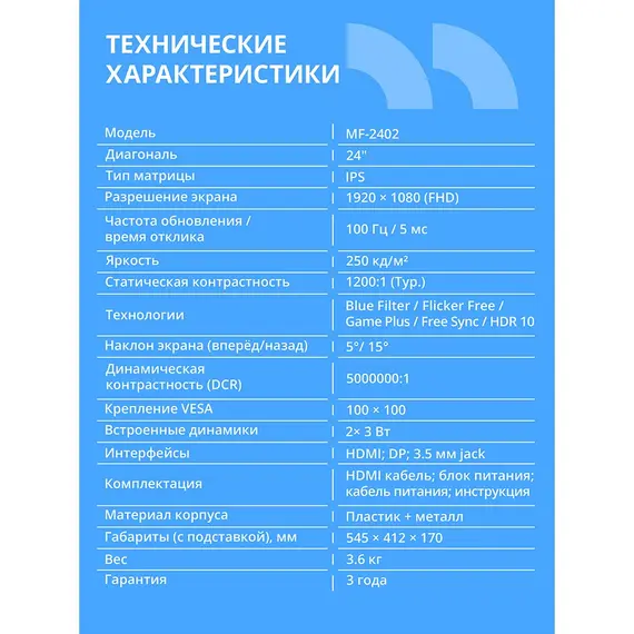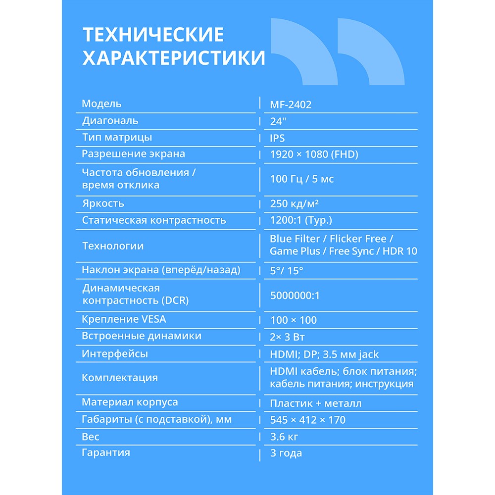 Монитор CBR MF 2402 23.8", IPS, 1920x1080 (Full HD), 5 мс, 75 Гц, 250 кд/м2, VGA, HDMI, DisplayPort, динамики, чёрный (LCD-MF2402-OPC)