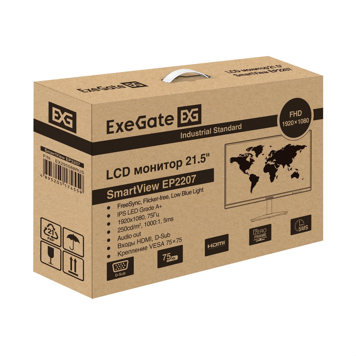Монитор EXEGATE SmartView EP2207 21.5", IPS, 1920x1080 (Full HD), 5 мс, 75 Гц, 250 кд/м2, VGA, HDMI, чёрный (EX295588RUS)