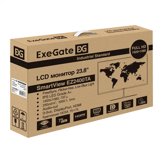 Монитор EXEGATE SmartView EZ2400TA 23.8", IPS, 1920x1080 (Full HD), 5 мс, 75 Гц, 250 кд/м2, VGA, HDMI, DisplayPort, чёрный (EX296282RUS)
