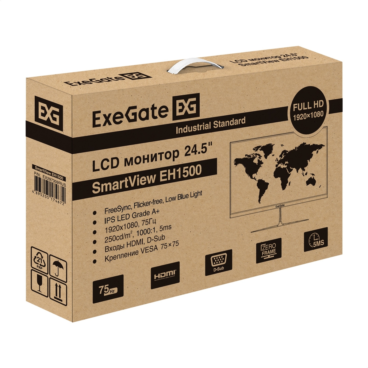 Монитор EXEGATE SmartView EH1500 24.5", IPS, 1920x1080 (Full HD), 5 мс, 75 Гц, 250 кд/м2, VGA, HDMI, чёрный (EX297309RUS)