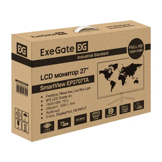 ExeGate SmartView EP2707TA — универсальный монитор с безрамочным дизайном, подходящий для повседневных задач, работы и развлечений. Он оснащён 27-дюймовым IPS-дисплеем с разрешением Full HD (1920x1080), который обеспечивает яркое и чёткое изображение, а также широкие углы обзора. Частота обновления 75 Гц и поддержка технологии AMD FreeSync обеспечивают плавную картинку.