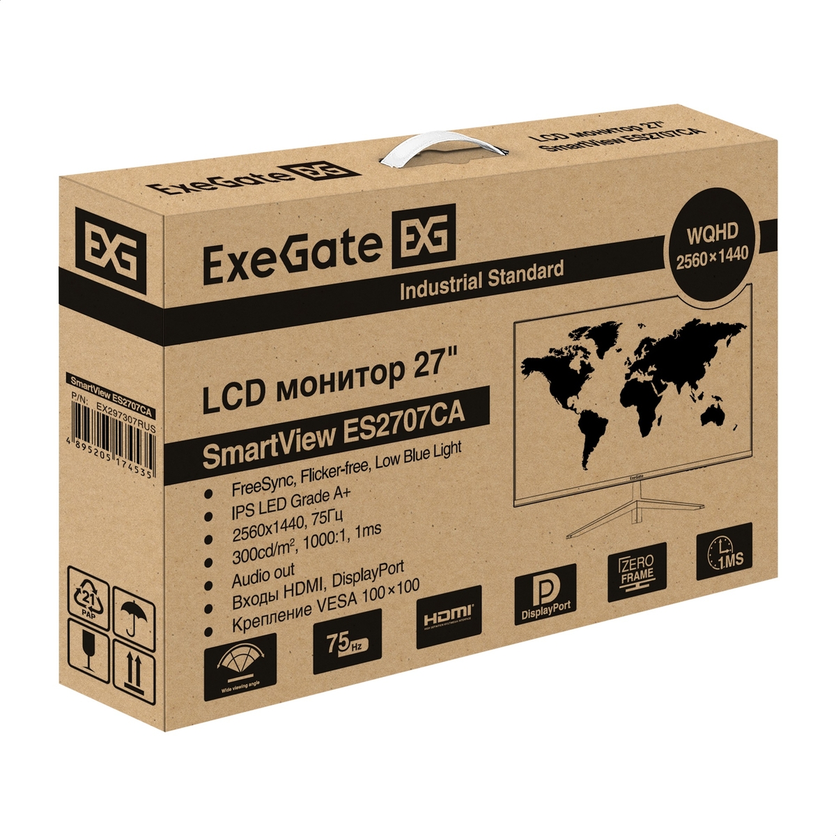 Монитор EXEGATE SmartView ES2707CA 27", IPS, 2560x1440 (Quad HD), 1 мс, 75 Гц, 300 кд/м2, HDMI, DisplayPort, чёрный (EX297307RUS)