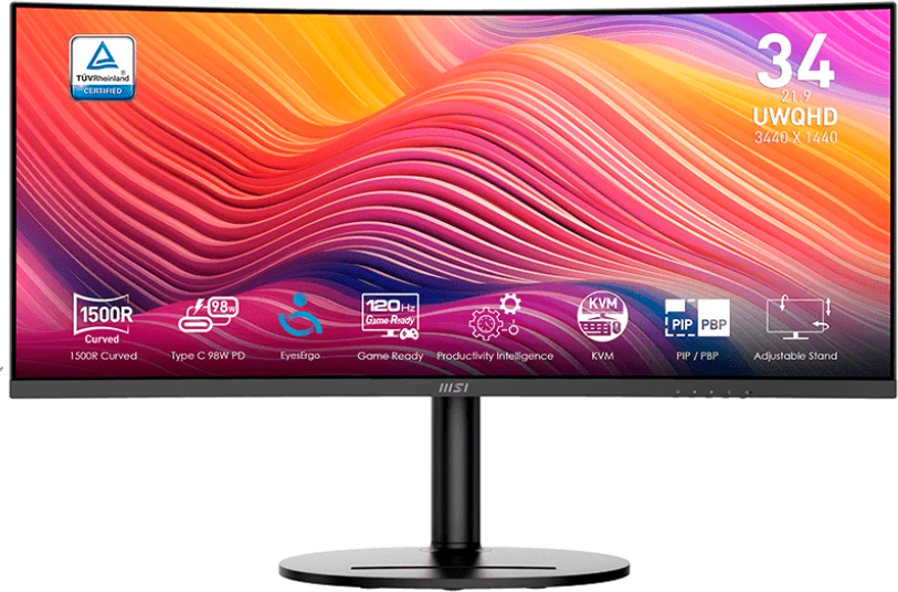 Монитор MSI Modern MD342CQP 34", VA, UltraWide, 3440x1440, изогнутый, 4 мс, 120 Гц, 300 кд/м2, 2xHDMI, DisplayPort, USB Type-C, динамики, чёрный (9S6-3PC59H-043)
