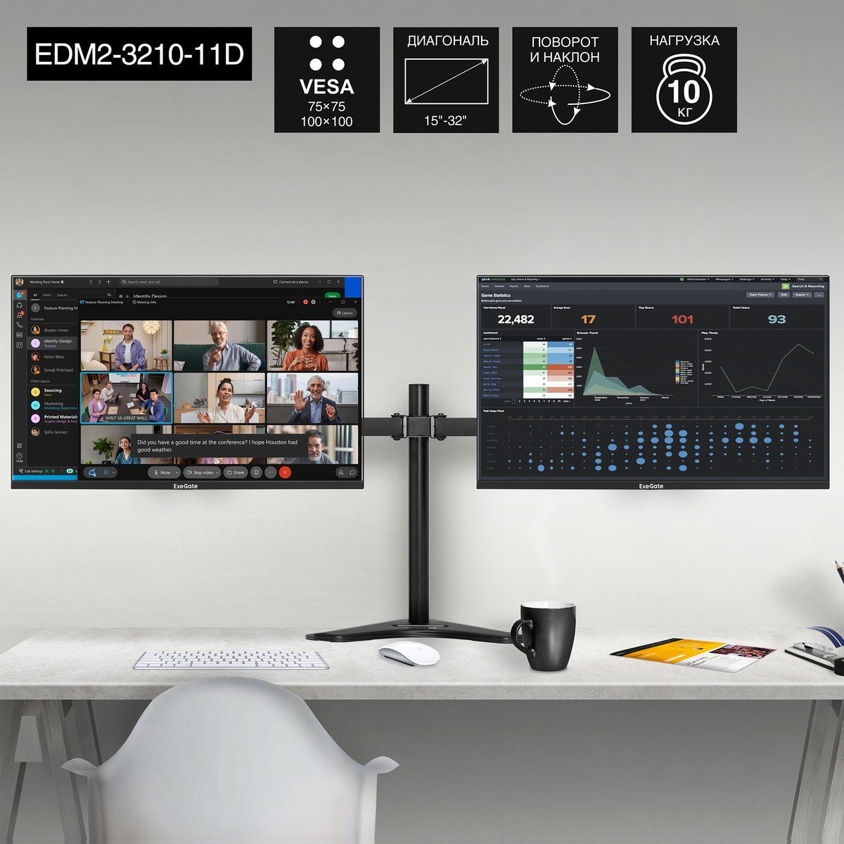 ExeGate EDM2-3210-11D — это премиальный инструмент для тех, кто ценит комфорт многомониторной работы, но не хочет ограничивать себя жестким креплением к столу.