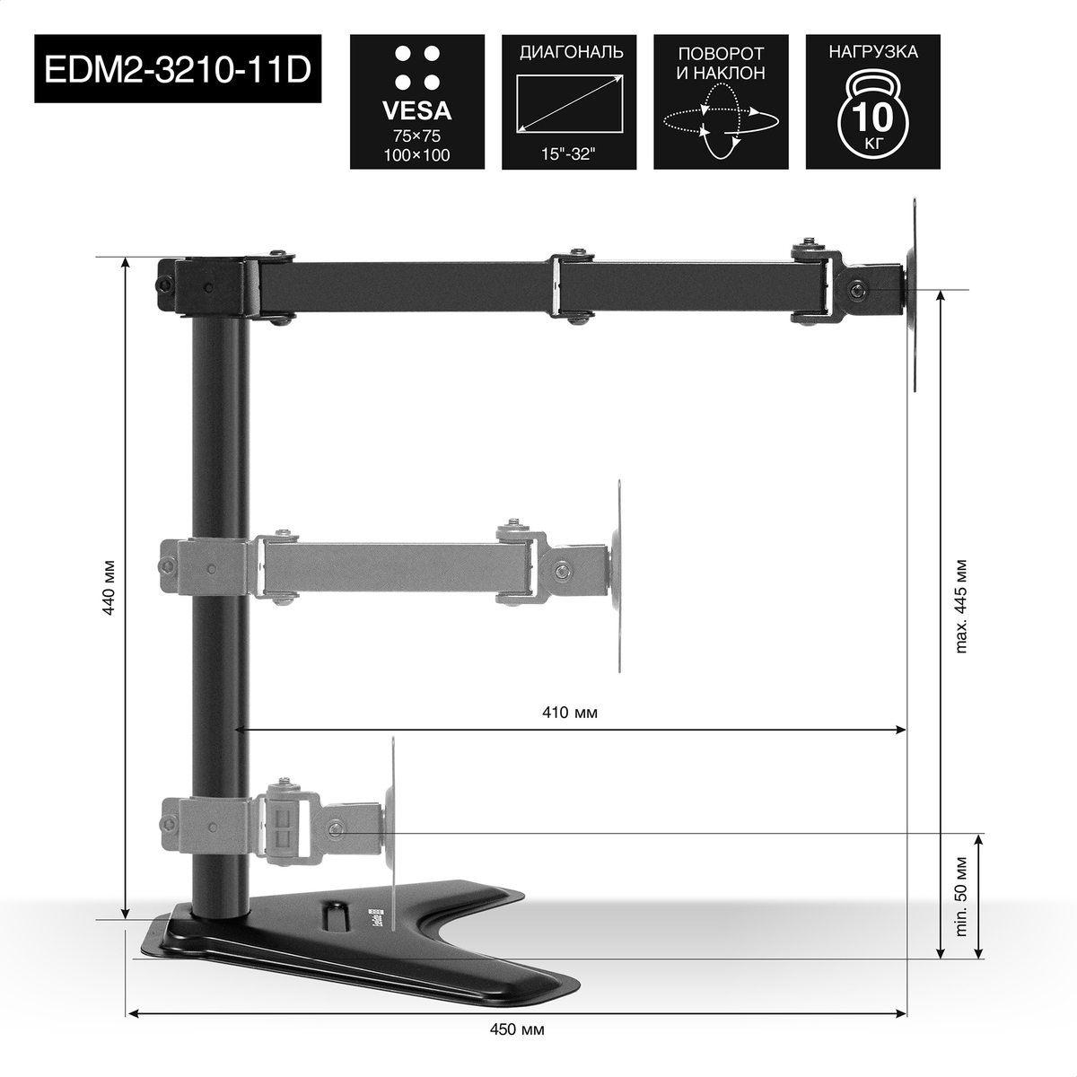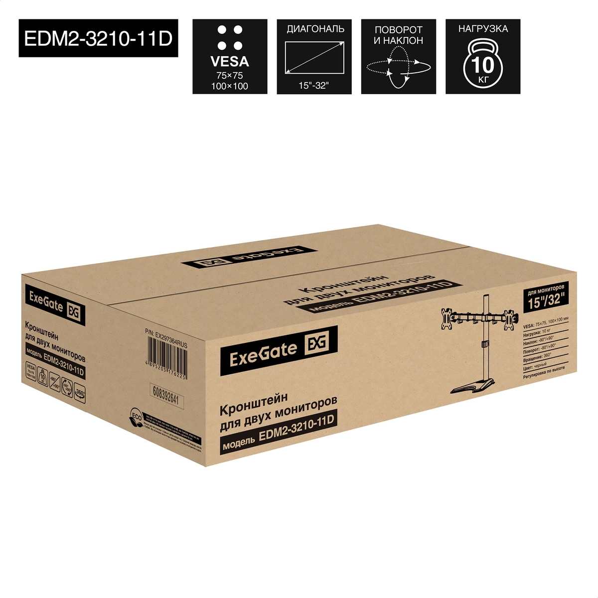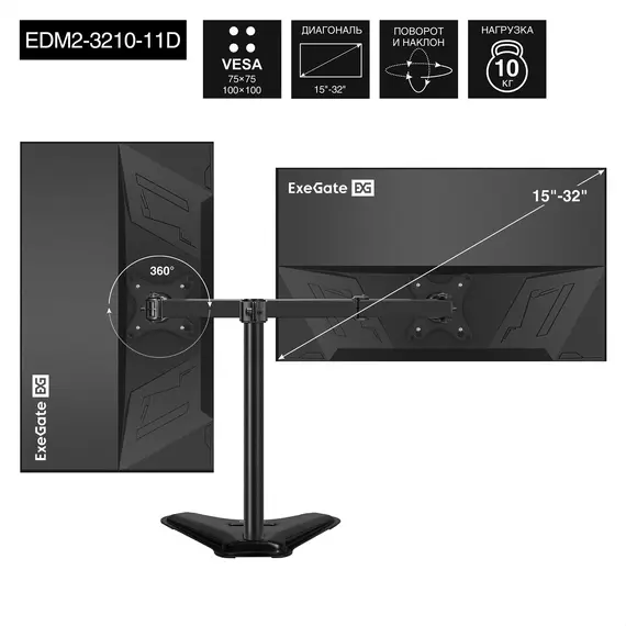 Кронштейн для монитора EXEGATE настольный с подставкой, EDM2-3210-11D (для для двух мониторов 15"-32", черный) (EX297364RUS)