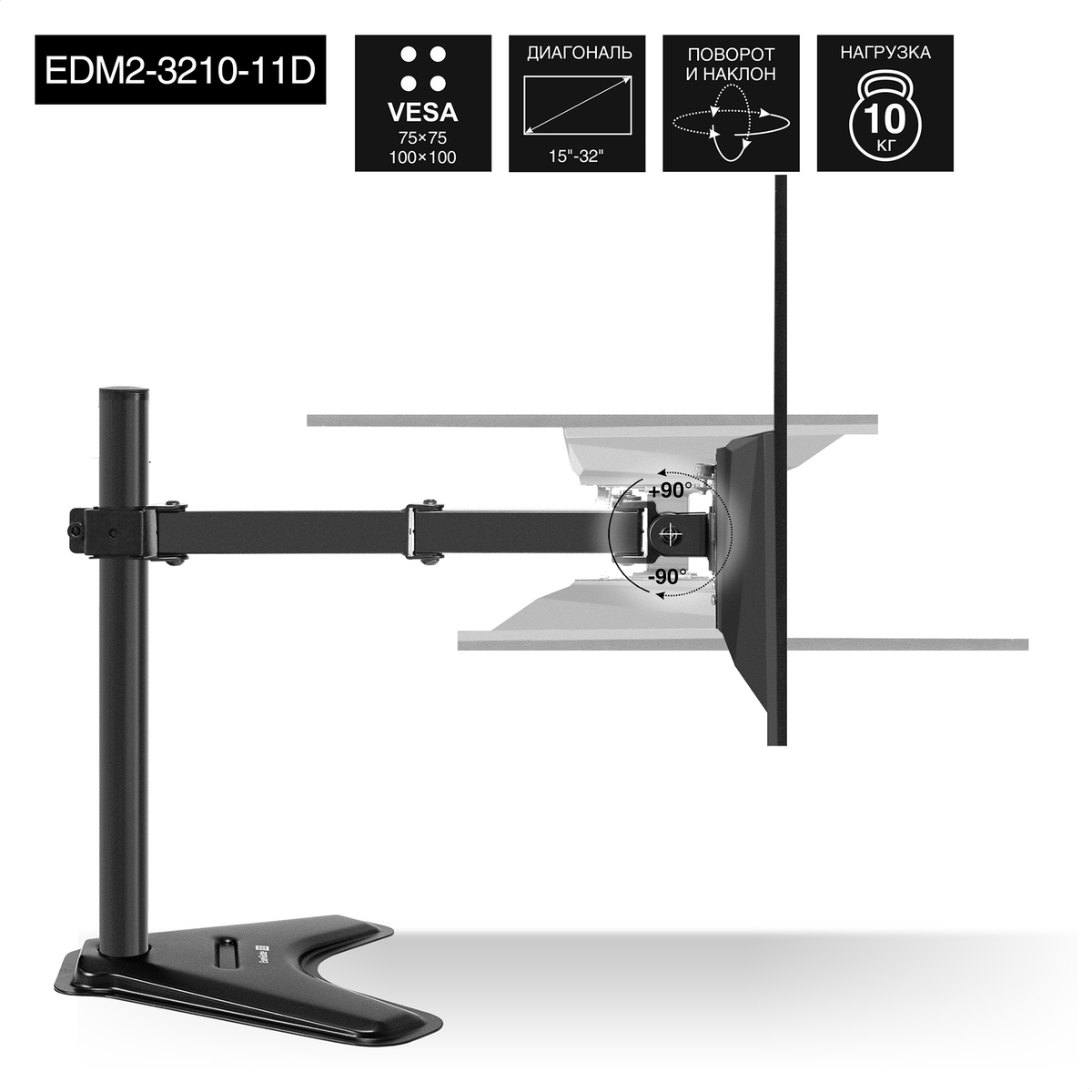 Подставка предназначена для дисплеев диагональю от 15 до 32 дюймов. Единая вертикальная стойка позволяет идеально выровнять мониторы по высоте, создавая бесшовное рабочее пространство.