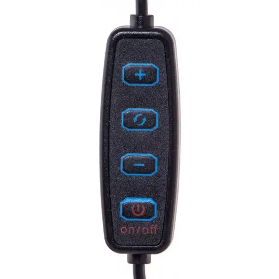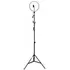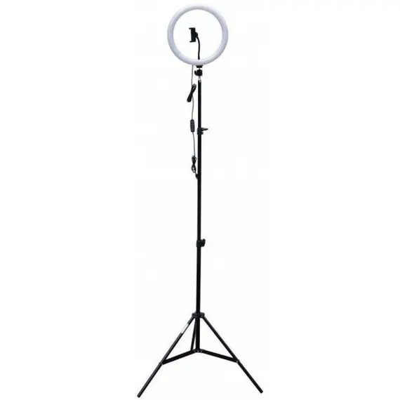 Комплектация Кольцевая светодиодная лампа. Шнур питания с пультом и USB-разъёмом. Держатель для смартфона. Гибкое шарнирное крепление (Goose neck). Крепление на стойку (штатив) с интегрированной шаровой головой.. Винт регулировки угла наклона лампы. Студийная стойка REKAM LS3?200?2 (75-200 см). Инструкция.