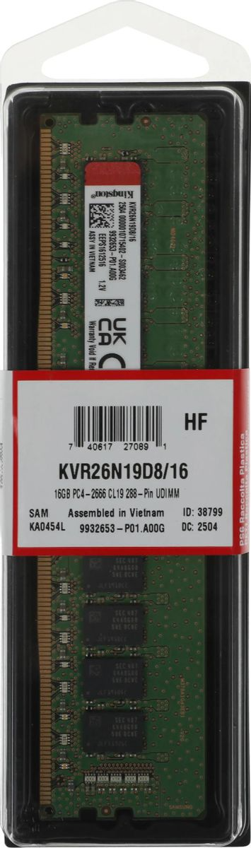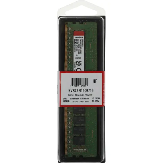 Память KINGSTON 16 Гб, DDR4 DIMM, 2666 МГц, ValueRAM 1 модуль, 21300 Мб/с, CL19, 1.2 В (KVR26N19D8/16)
