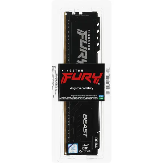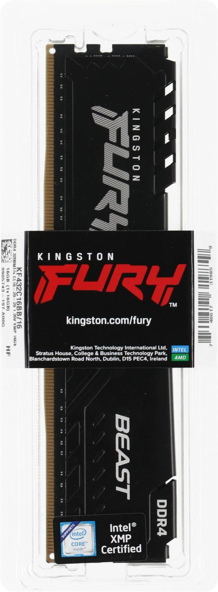 Память KINGSTON 16 Гб, DDR4 DIMM, 3200 МГц, FURY Beast Black 1 модуль, 25600 Мб/с, CL16, 1.35 В, XMP, радиатор (KF432C16BB/16)
