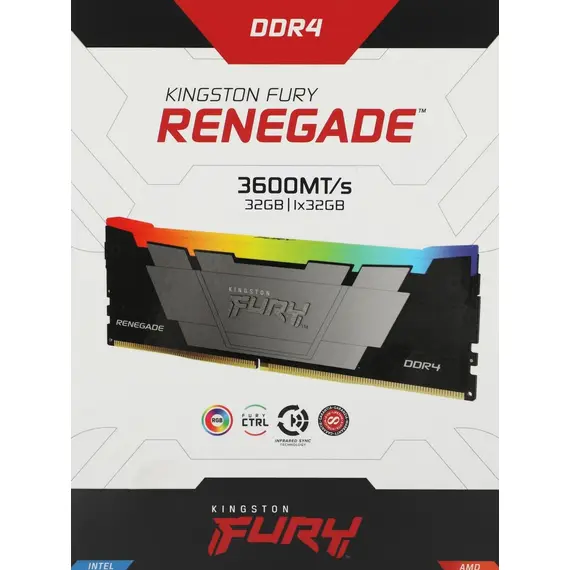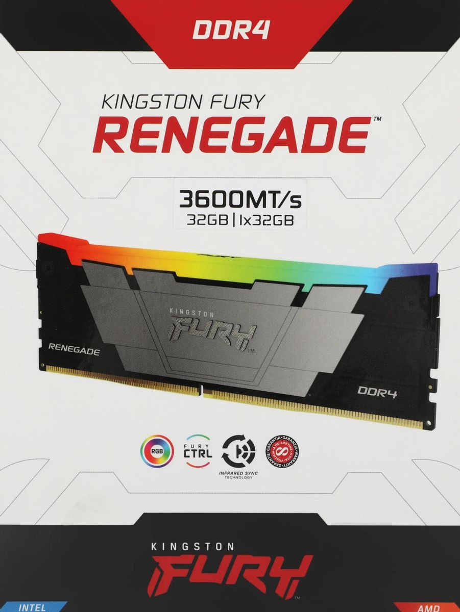 Память KINGSTON 32 Гб, DDR4 DIMM, 3600 МГц, FURY Renegade RGB Black 1 модуль, 28800 Мб/с, CL18, 1.35 В, XMP, радиатор, подсветка (KF436C18RB2A/32)
