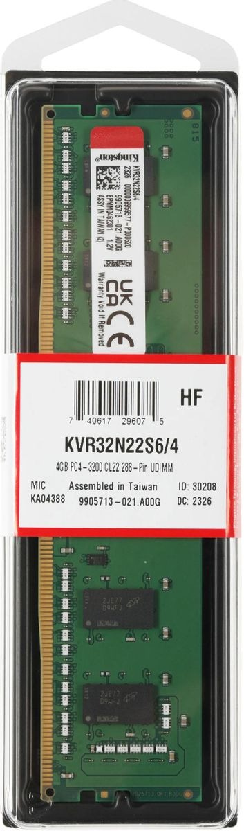 Память KINGSTON 4 Гб, DDR4 DIMM, 3200 МГц, ValueRAM 1 модуль, 25600 Мб/с, CL22, 1.2 В (KVR32N22S6/4)