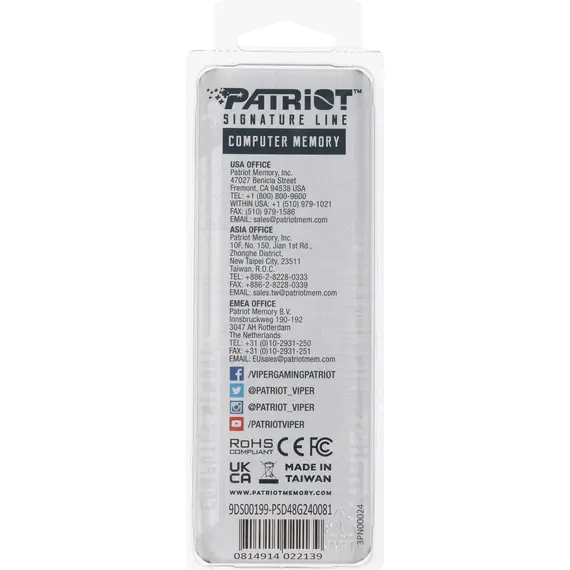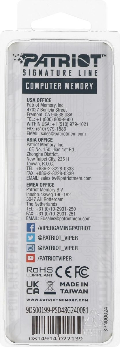- Проверенная и надежная серия Signature Line: Продукция Patriot Signature Line известна своей высокой стабильностью и долговечностью. Каждый модуль проходит тщательное тестирование, что гарантирует его надежную работу в течение всего срока службы.