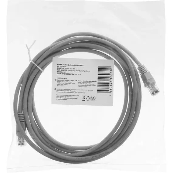 Патч-корд KINGPRICE 1Гбит/с UTP 4 пары cat.5E CCA molded 3м серый RJ-45 (m)-RJ-45 (m) (KP-PC-C5E-3M-G)