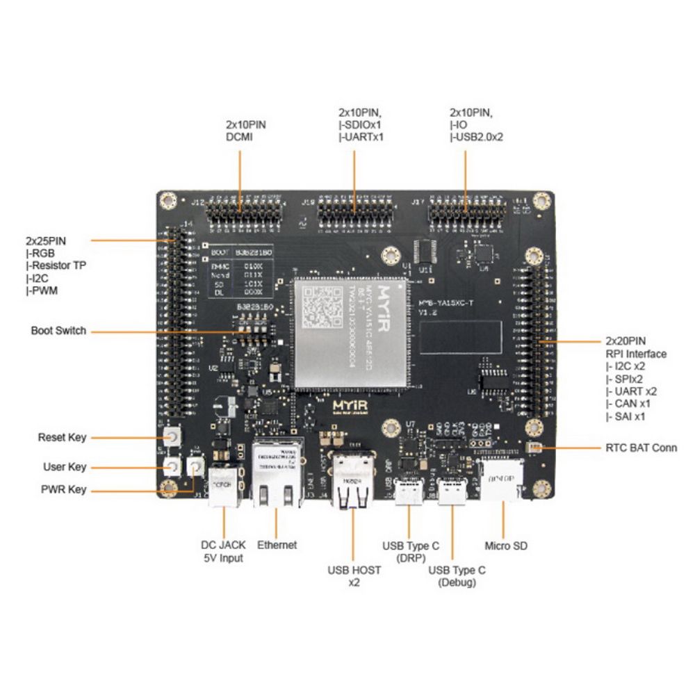 Плата разработки Myir MYD-YA151C-4E512D-65-I-T MYC-YA15XC-T CPU Module as Controller Board,ST STM32MP1 MPU based on 650MHz Single or Dual Arm Cortex-A7 and 209MHz Cortex-M4 Cores,256MB/512MB DDR3L, 256MB Nand Flash/ 4GB eMMC, 32KB EEPROM, Power Management IC (PMIC)