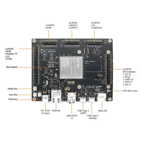 20-pin (2xI2C, 2xSPI, 2xUART, 1xCAN, 1xSAI), 50-pin (RGB, Resistor TP, I2C, PWM), 20-pin DCMI, 20-pin (1xSDIO, 1xUART), 20-pin (IO, 2xUSB2.0), RTC Bat.conn.