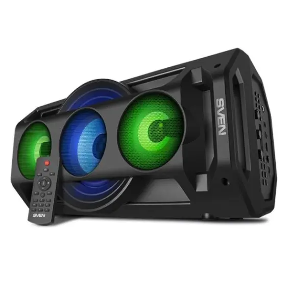 Портативная колонка SVEN стерео, мощность 65 Вт, корпус из пластика, Bluetooth, питание от USB, от батарей, поддержка карт памяти, радиотюнер, пульт ДУ, PS-680 Black (SV-020187)