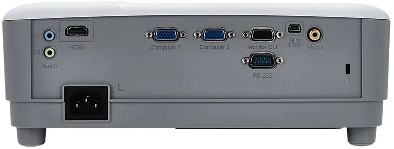 • Универсальность подключения: Наличие двух входов HDMI и VGA обеспечивает совместимость с современными ноутбуками, ПК, а также устаревшим оборудованием. Есть порт для USB-носителя для прямого воспроизведения медиафайлов.