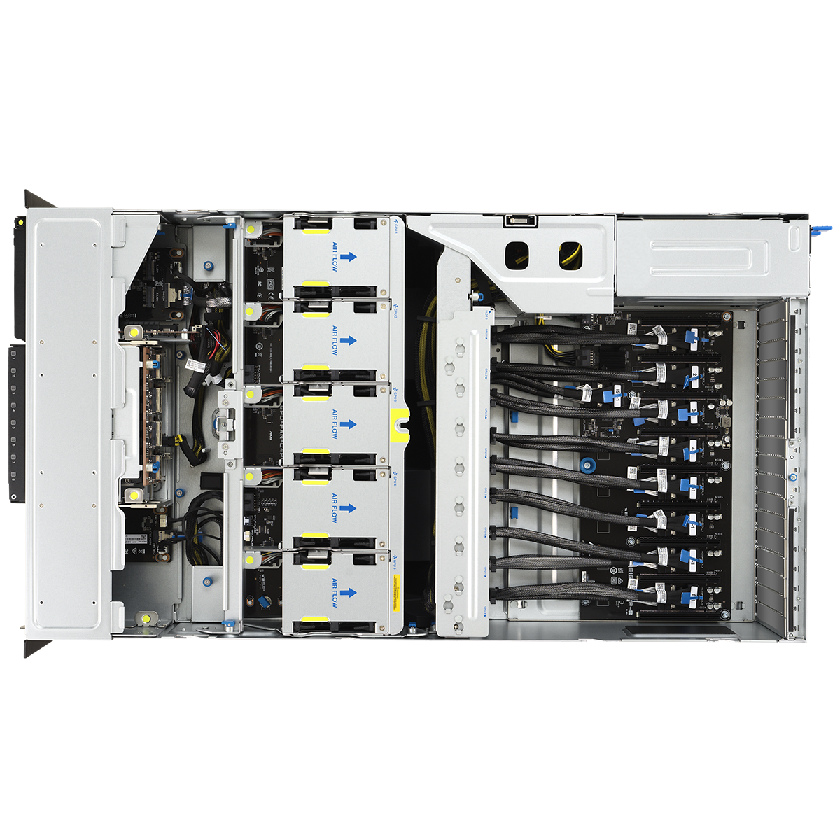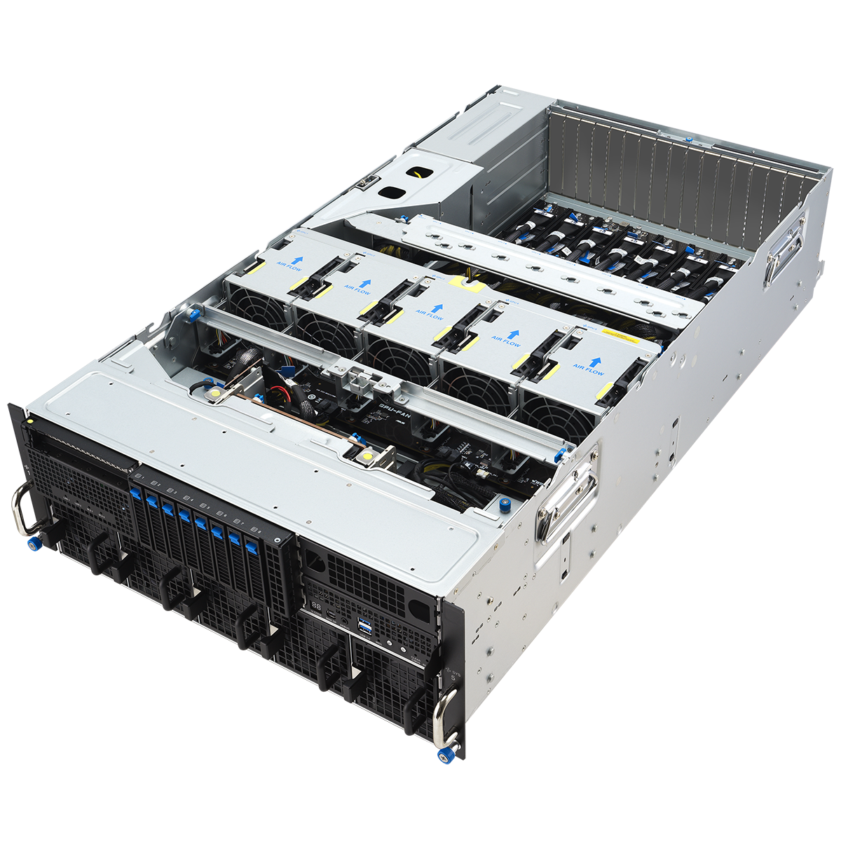 - Поддержка до 8 двухслотовых GPU: Конструкция позволяет установить до восьми мощных видеокарт (NVIDIA или AMD) с интерфейсом PCIe 5.0, обеспечивая колоссальную вычислительную мощность для параллельных вычислений.