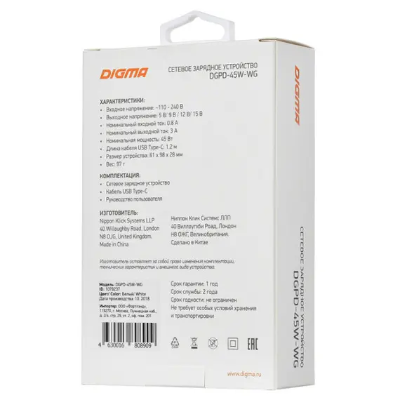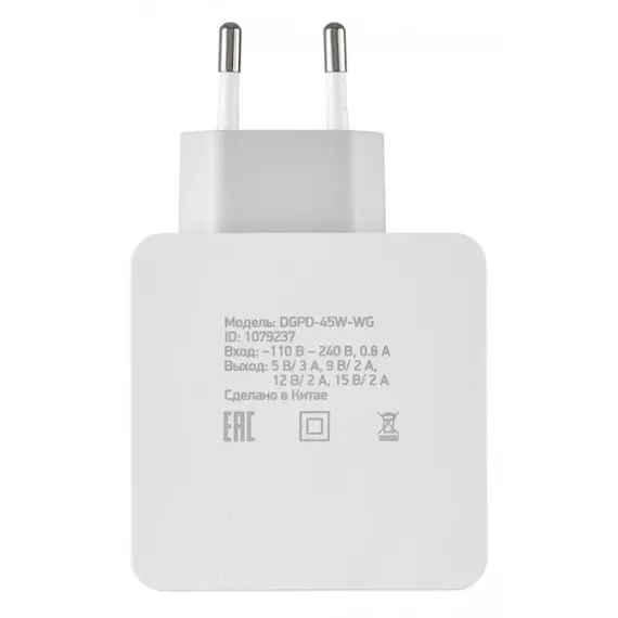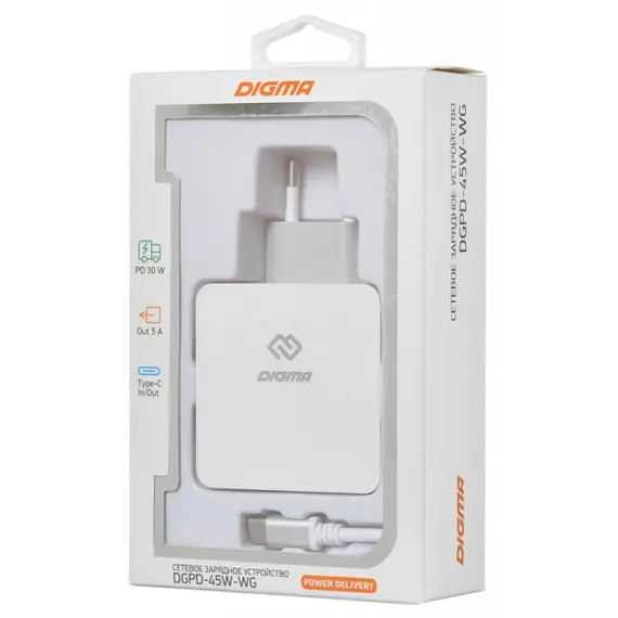 Сетевое зарядное устройство DIGMA 45 Вт, сила тока 3 A, 1x USB, 1x USB Type-C (DGPD-45W-WG)