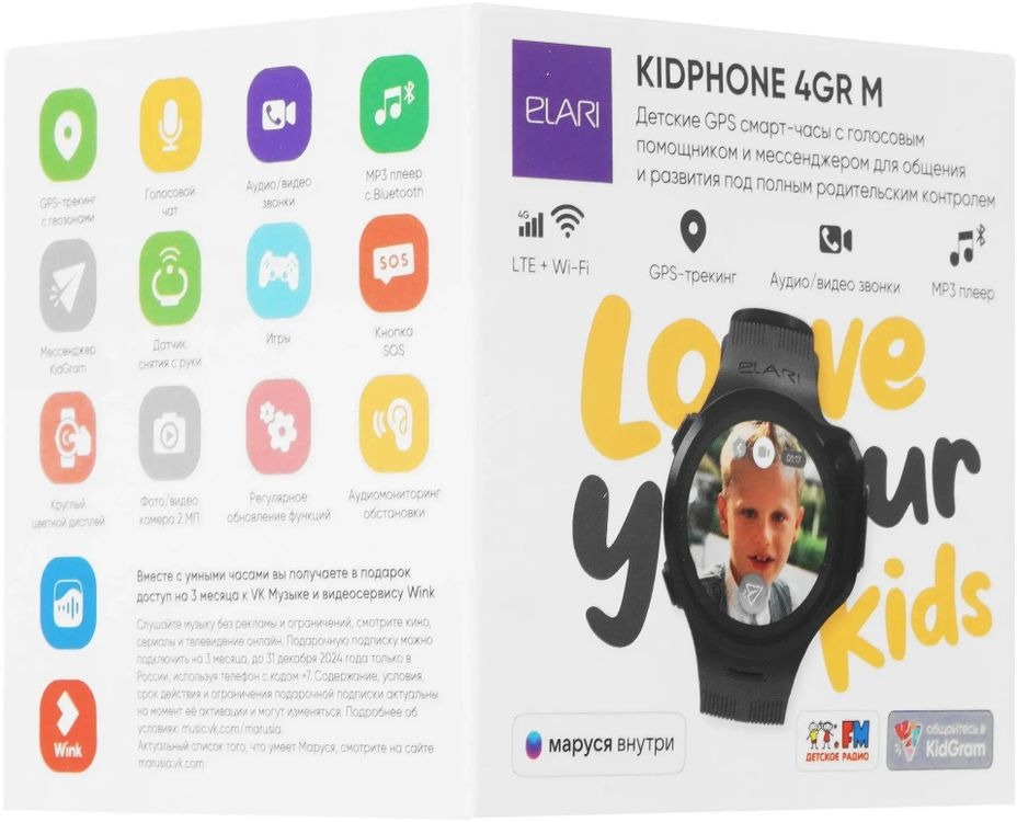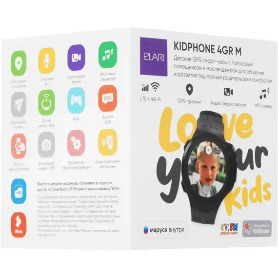 Смарт-часы детские ELARI 4GR M телефон - черные, 4G, nano-SIM, Маруся, сенсорный дисплей 1.3 IPS 240х240 (KP-4GR-M-BLK)
