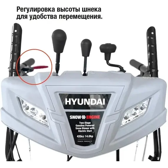 Модель оборудована мощным зимним 4-тактным двигателем Hyundai ICW420 объемом 420 куб. см и мощностью 14 л.с., что обеспечивает исключительную производительность и позволяет справляться с любыми объемами и типами снега.