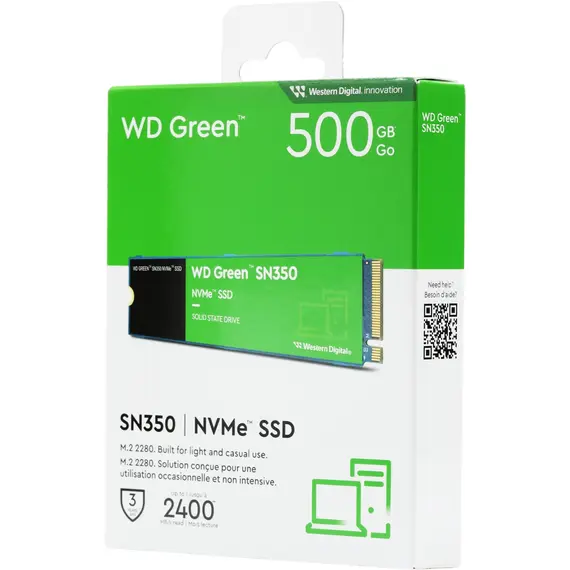 SSD накопитель WD 500 Гб, внутренний, M.2, 2280, PCI-E x4, NVMe, TLC, Western Digital Green SN350 (WDS500G2G0C)