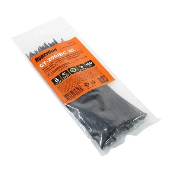 Стяжки HYPERLINE неоткрывающаяся, безгалогенная (halogen free), 200x2.5 мм, полиамид 6.6, -40°C - +85°C, черная, (100 шт) (GT-200IBC-25)