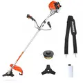 Комплектация    Триммер, коробка, ремень ранцевый, шпуля с леской, диск 40-зубовый, очки, набор ключей, набор крепежа, емкость для смешивания топлива, кожух защитный, инструкция по эксплуатации