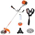 Комплект поставки Блок двигателя, Штанга, Комплект крепежа, Комплект рукояток, Ранцевый ремень, Защитный кожух, Бутылка, Нож, Шпуля с леской