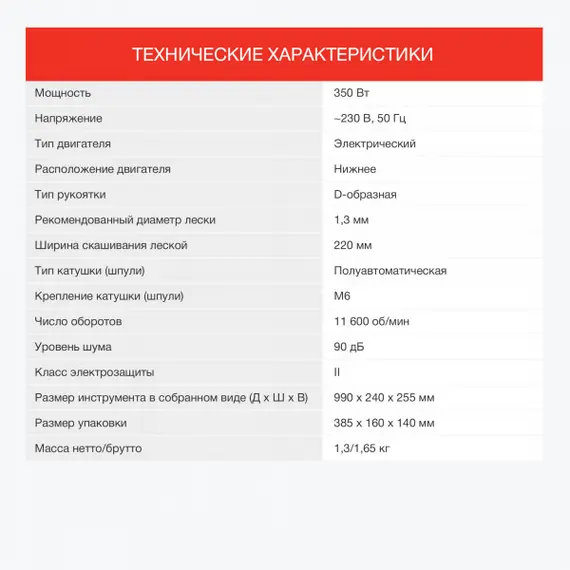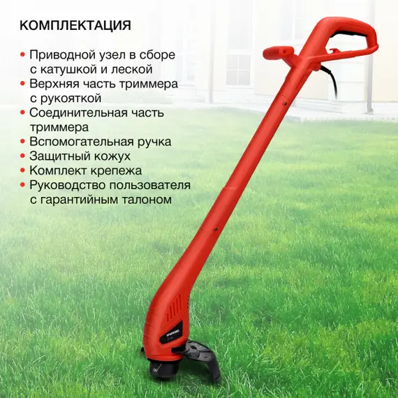 Комплект поставки    Приводной узел в сборе с катушкой и леской, Верхняя часть триммера с рукояткой, Соединительная часть триммера, Вспомогательная ручка, Защитный кожух, Комплект крепежа, Руководство пользователя с гарантийным талоном