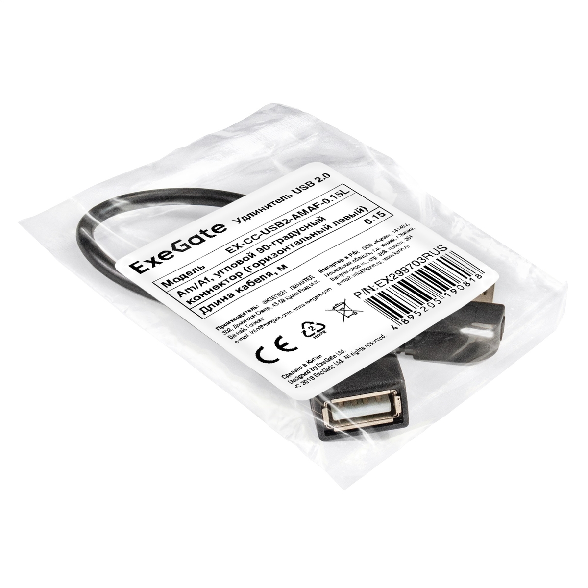 Удлинитель EXEGATE USB 2.0 EX-CC-USB2-AMAF-0.15L (Am/Af, угловой 90-градусный коннектор (горизонтальный левый), 0,15м) (EX299703RUS)