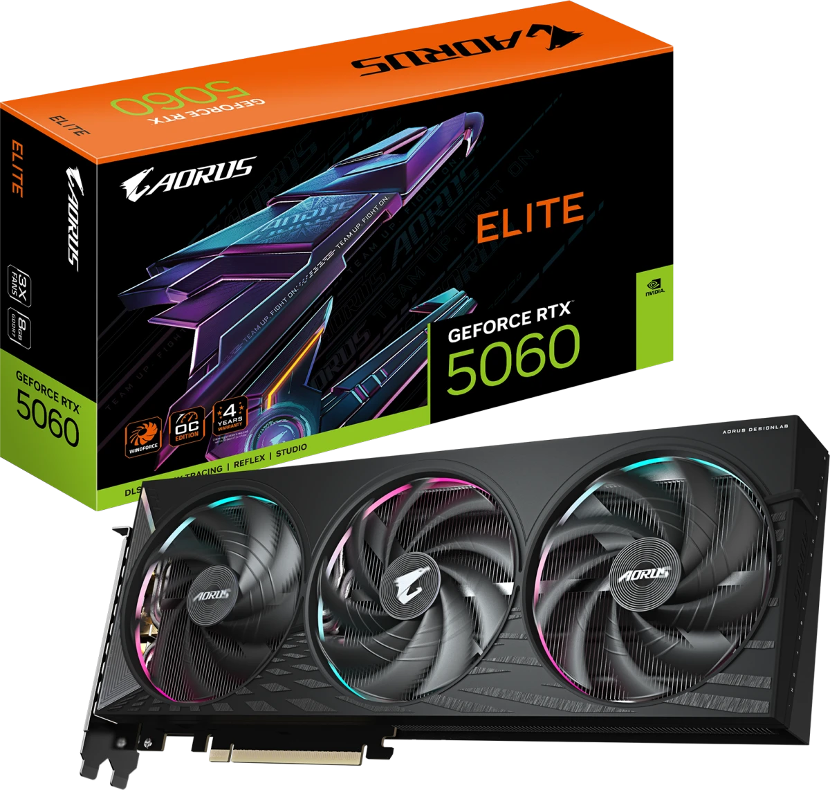 Видеокарта GIGABYTE GeForce RTX 5060, 8 Гб, ELITE 8G GDDR7, 128 бит, 3FAN (GV-N5060AORUS E-8GD)