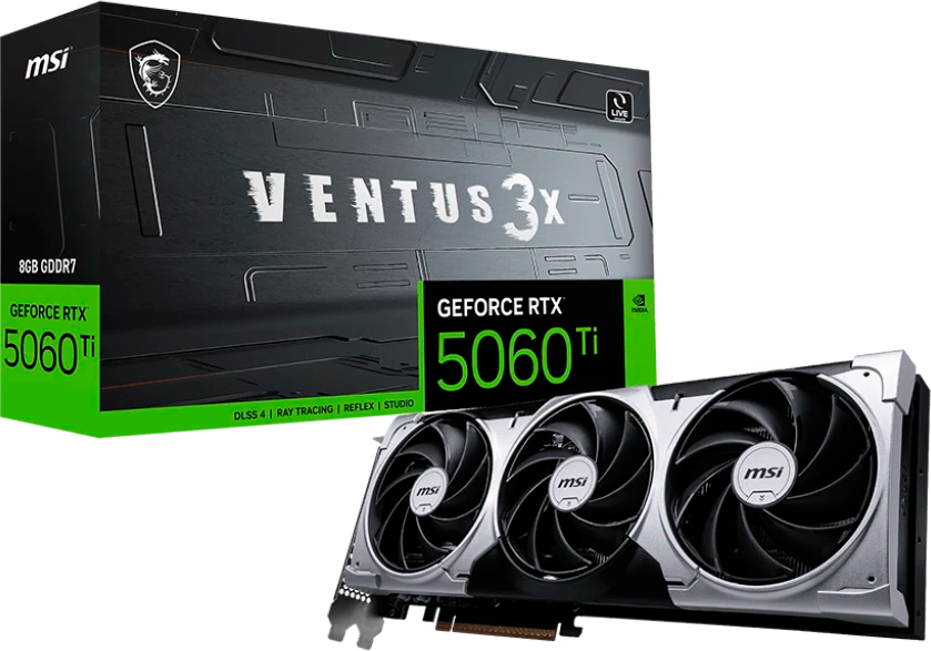 RTX 5060 TI 8G VENTUS 3X - делает упор на главное: мощное охлаждение, устойчивый к нагрузкам корпус и универсальный дизайн, идеально подходящий для интеграция в любую сборку.