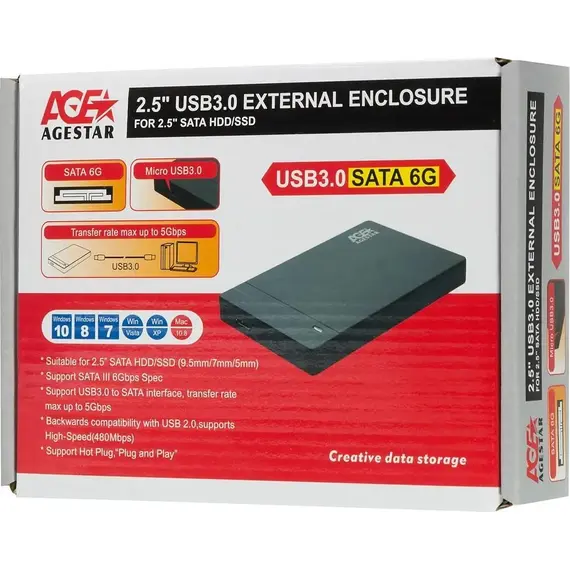 Внешний корпус для HDD/SSD AGESTAR 2.5", SATA, USB 3.0, пластик, чёрный, External Enclosure (3UB2P3 BLACK)