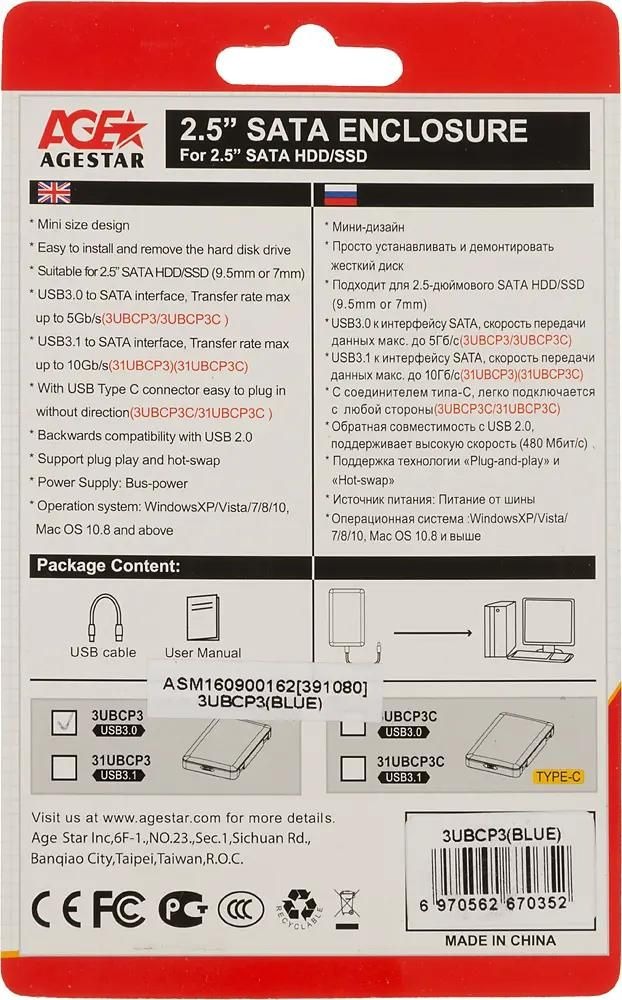 Внешний корпус для HDD/SSD AGESTAR 2.5", SATA, USB 3.0, пластик, синий (3UBCP3 BLUE)