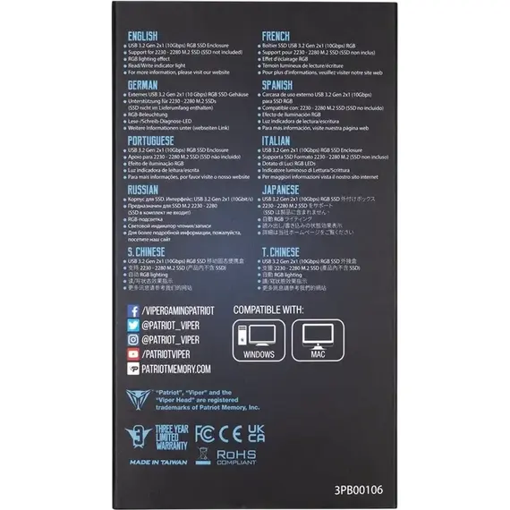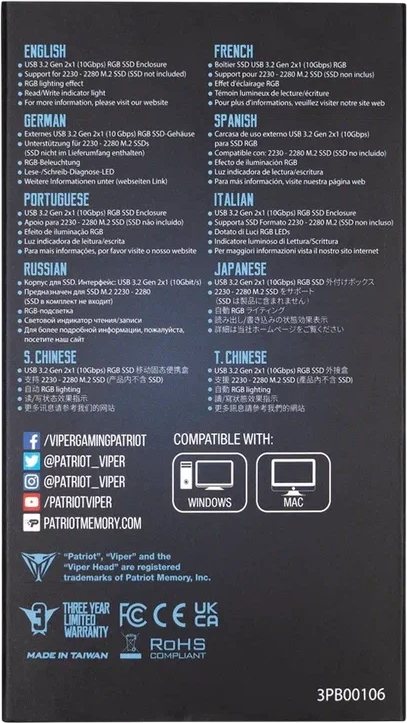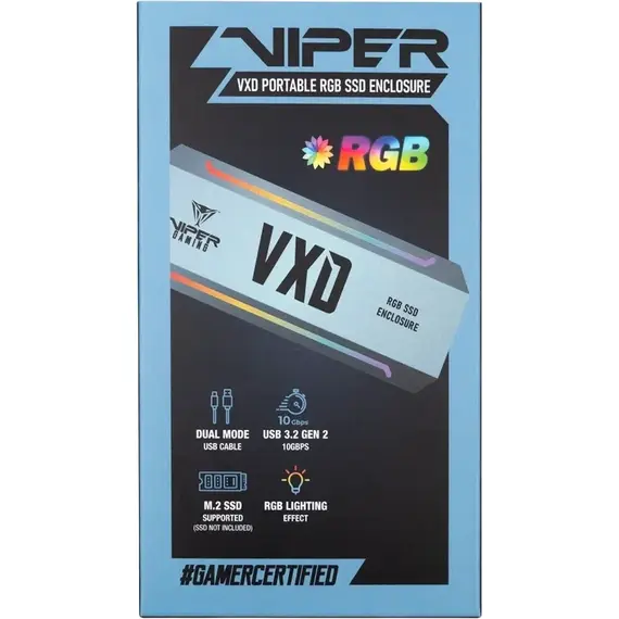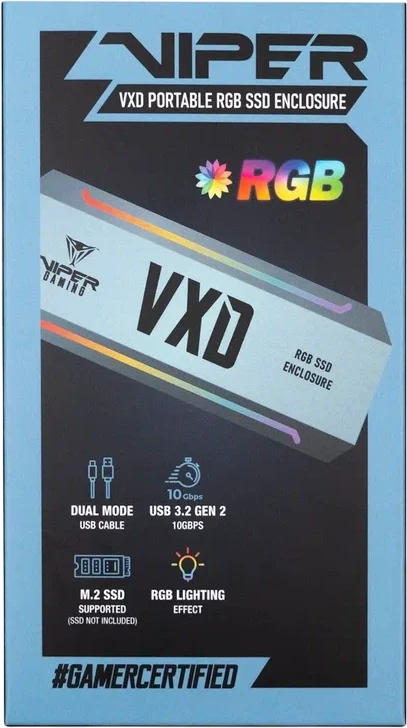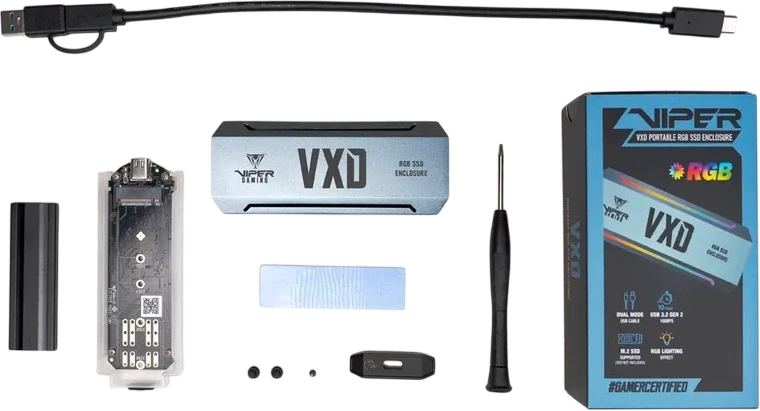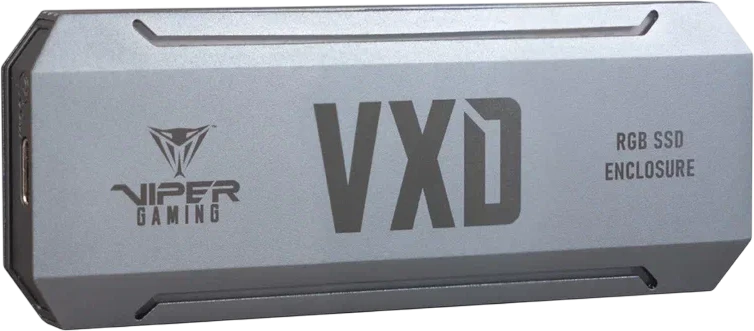 Внешний корпус для SSD PATRIOT MEMORY M.2, NVMe, USB 3.2 Gen 2, металл, серебристый, подсветка, Viper VXD RGB (PV860UPRGM)