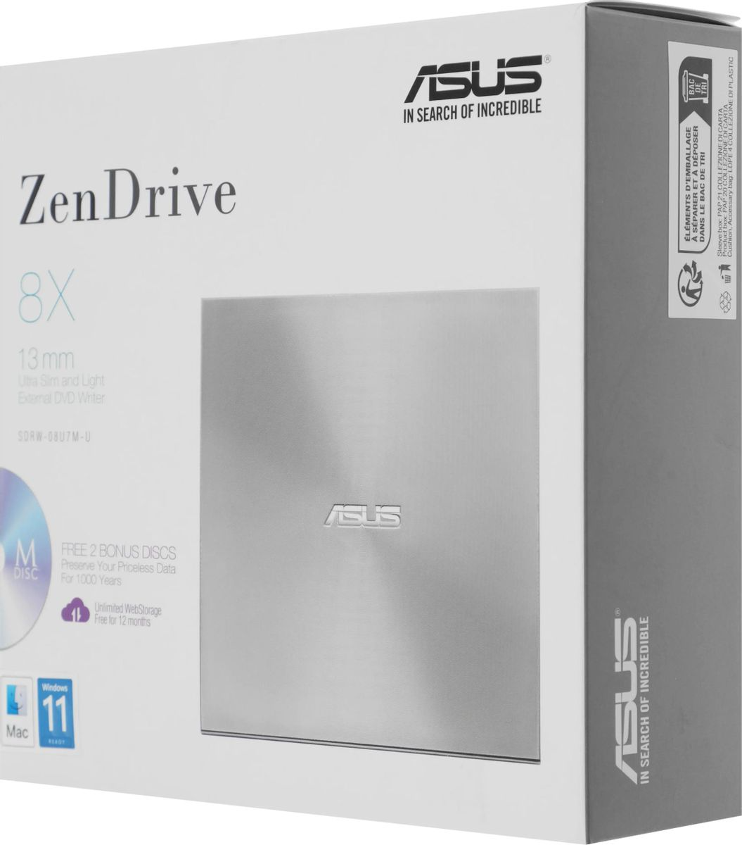 Привод внешний ASUS DVD-RW SDRW-08U7M-U серебристый USB ultra slim внешний RTL (SDRW-08U7M-U/SIL/G/AS)