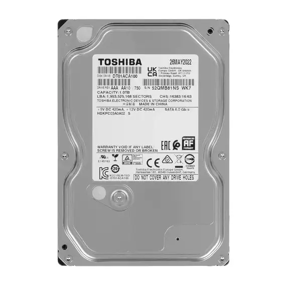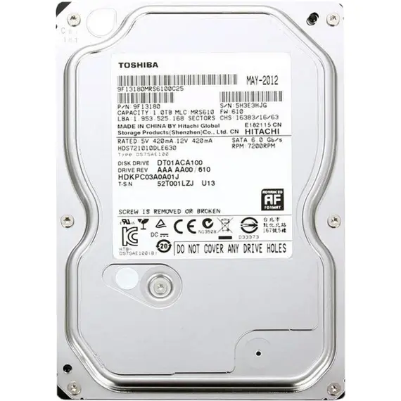 Жесткий диск TOSHIBA 1 Тб, SATA-III, 7200 об/мин, кэш 32 Мб, 3.5", OEM (Toshiba DT01ACA100)